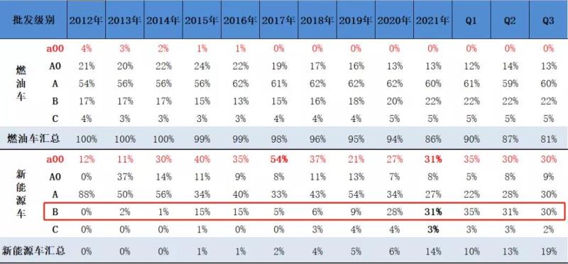 參照燃油車市場(chǎng),A、B級(jí)車是主流,A00級(jí)別車型基本沒(méi)有市場(chǎng)。而在新能源市場(chǎng),低續(xù)航的A00級(jí)別車型占比最高,但是其市占率正逐漸萎縮;反觀高續(xù)航B級(jí)電動(dòng)車的滲透率正快速提升。