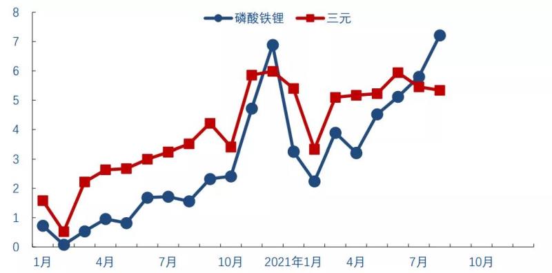 圖3:今年6月份以來(lái)磷酸鐵鋰的裝機(jī)量超過(guò)三元,資料來(lái)源:中國(guó)汽車動(dòng)力電池產(chǎn)業(yè)創(chuàng)新聯(lián)盟,華創(chuàng)證券