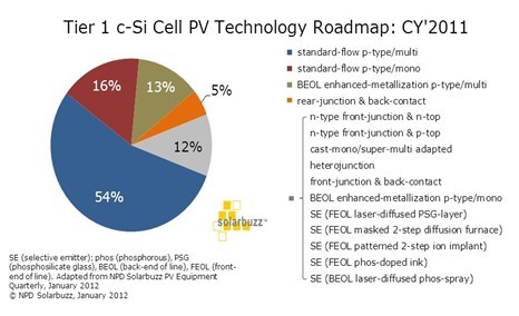 當審視各種更高轉換效率的應用時,在2011年一線廠商生產(chǎn)了至少15種不同類型的電池,如圖1所示。即使是最常被提到的,統(tǒng)稱為選擇性發(fā)射極的技術,根據(jù)其生產(chǎn)線前段或后段的不同選擇也分為多種不同的類型。