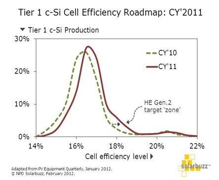 中國儲能網(wǎng)訊:根據(jù)最新出版的NPDSolarbuzz光伏設備季度報告指出,不斷提高光電轉換效率和組件額定功率已是當今光伏行業(yè)的關鍵指標。這不僅是整個行業(yè)的長期目標,而且是在競爭激烈的光伏產(chǎn)業(yè)環(huán)境下領軍廠商脫穎而出的必要條件。光電轉換效率的提高意味著制造工藝流程和原材料(主材和輔材)的改變,理想情況下,引領這些改變的各種技術構成了一份技術路線圖。