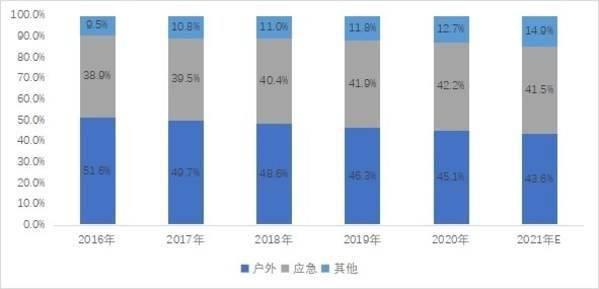 從2016到2021年不同應(yīng)用領(lǐng)域的市場(chǎng)份額來看,戶外應(yīng)用領(lǐng)域仍是主要的應(yīng)用場(chǎng)景,市場(chǎng)占比在40%以上其次是應(yīng)急領(lǐng)域,隨著全球極端天氣的頻發(fā),在地震、海嘯、颶風(fēng)、大火、暴雪等自然災(zāi)害多發(fā)的地區(qū),便攜儲(chǔ)能產(chǎn)品能解決災(zāi)害缺電、停電、應(yīng)急救援等電力短缺問題家庭用戶以及應(yīng)急救援對(duì)應(yīng)急電源備用的需求進(jìn)一步增加,將帶動(dòng)便攜式儲(chǔ)能在應(yīng)急領(lǐng)域的出貨量,其市場(chǎng)份額也有所提升,達(dá)到40%以上在車充、DIY以及電力缺乏等其他領(lǐng)域,隨著鋰電池成本的下降和用戶購買力的提升,其他領(lǐng)域市場(chǎng)的占比也會(huì)有所提升。