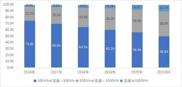 2016-2021年不同容量產(chǎn)品份額變化趨勢(shì)
