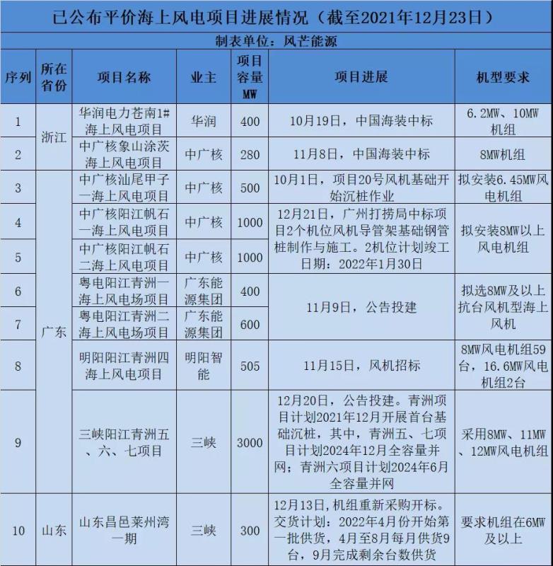 據(jù)風(fēng)芒能源統(tǒng)計(jì),根據(jù)公開(kāi)新聞,目前已有12個(gè)共計(jì)7.985GW海上風(fēng)電平價(jià)項(xiàng)目正式啟動(dòng)。其中,有2個(gè)項(xiàng)目已完成機(jī)組中標(biāo)公示;2個(gè)項(xiàng)目發(fā)布機(jī)組采購(gòu)公告;5個(gè)項(xiàng)目已宣布要投建;3個(gè)項(xiàng)目開(kāi)始施工。