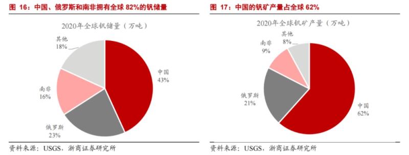 由于釩是一種小金屬,應(yīng)用場(chǎng)景并不豐富,目前全球近62%的釩由中國產(chǎn)出,俄羅斯和南非分別產(chǎn)出21%和9%。