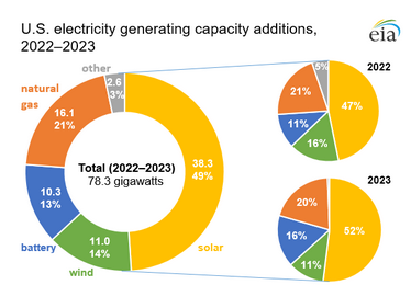 美國能源信息署(EIA)預(yù)計,美國未來兩年所有能源的裝機(jī)容量將增加78GW。其中大部分將是大型太陽能發(fā)電設(shè)施和儲能項目,預(yù)計將增長62%,總裝機(jī)容量為49GW。這個數(shù)字并不包括小型分布式住宅太陽能發(fā)電項目增加的裝機(jī)容量。