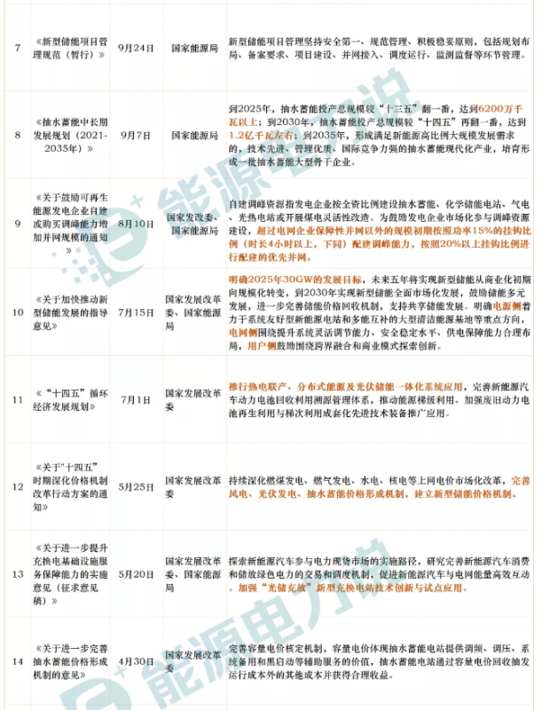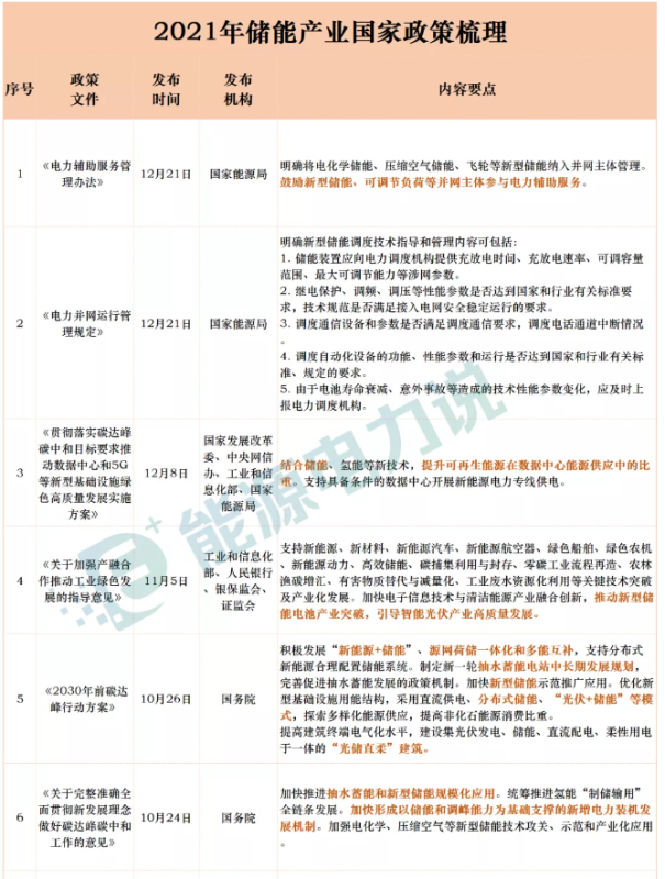 2021年儲能產(chǎn)業(yè)國家政策匯總如下表: