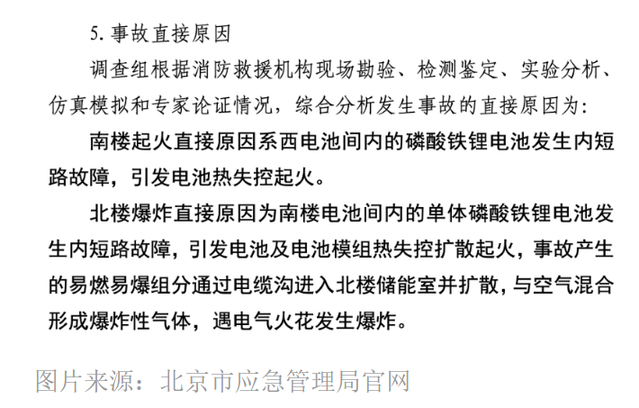 根據(jù)北京市應急管理局11月22日發(fā)布的事故調查報告,認定起火的直接原因是電池間內的磷酸鐵鋰電池發(fā)生內短路故障,引發(fā)電池熱失控起火,接著又引發(fā)了相鄰北樓電池的起火爆炸。