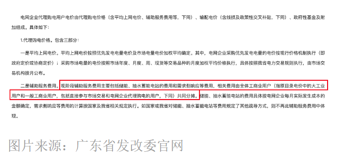 廣東省則更進一步,要將儲能費用也納入電價。12月1日,廣東省發(fā)改委批復同意了《廣東省電網(wǎng)企業(yè)代理購電實施方案(試行)》,其中明確了代理購電價格中的輔助服務費用,主要包括儲能、抽水蓄能電站的費用和需求側響應等費用,“相關費用由全體工商業(yè)用戶共同分攤”。