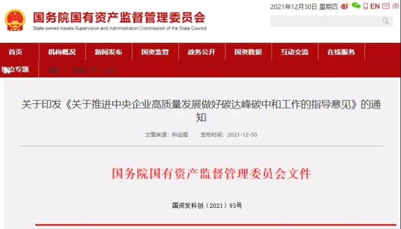 關(guān)于印發(fā)《關(guān)于推進中央企業(yè)高質(zhì)量發(fā)展做好碳達峰碳中和工作的指導(dǎo)意見》的通知