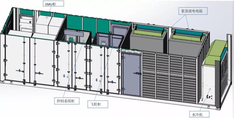 坎德拉新能源順應(yīng)新型電力系統(tǒng)發(fā)展趨勢(shì),前瞻研發(fā),提前布局,根據(jù)不同省市一次調(diào)頻應(yīng)用場(chǎng)景的需求,推出適用于火電、風(fēng)電、光伏一次調(diào)頻全應(yīng)用場(chǎng)景的MW級(jí)飛輪儲(chǔ)能系統(tǒng)解決方案(如圖),其中飛輪儲(chǔ)能系統(tǒng)包含控制系統(tǒng)柜、飛輪儲(chǔ)能單元、水冷機(jī)、緊急放電電阻、集裝箱、EMU等。