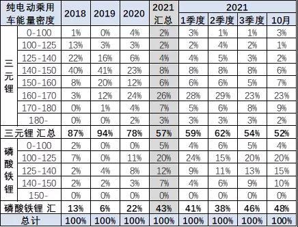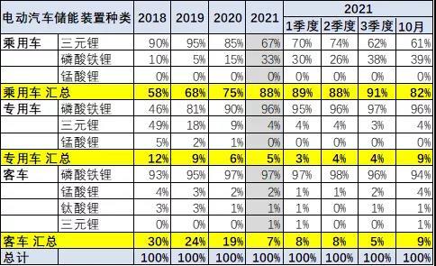 從分類數(shù)據來看,乘用車的三元鋰電的需求暫時回落,2021年4季度的10月達到整體汽車電池需求的61%。3季度的磷酸鐵鋰需求明顯回升,達到38%。