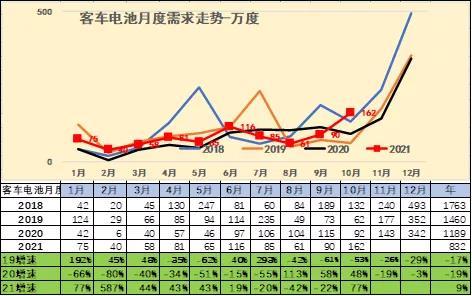 2021年由于疫情影響的1-10月客車的電池需求較低,同比2020年的1189萬度的高位,增幅不大。