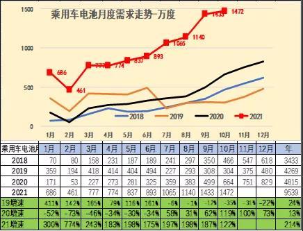 2021年1-10月的乘用車電池需求9539萬度,同比增長2倍,表現(xiàn)較強。2020年1-10月乘用車的電池需求較好,2021年的環(huán)比持續(xù)走強,需求平穩(wěn)增長。