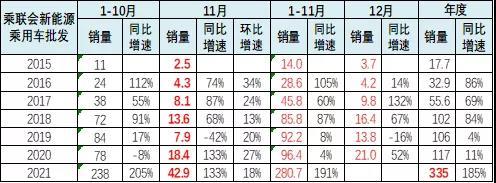 2020年乘用車新能源車銷量達到117萬臺,同比增長11%。2021年11月新能源乘用車批發(fā)銷量達到42.9萬輛,環(huán)比增長17.9%,同比增長133%。1-11月新能源乘用車批發(fā)280.7萬輛,同比增長191%。新能源車與傳統(tǒng)燃油車走勢形成強烈差異化的特征,實現(xiàn)對燃油車市場的替代效應,并拉動車市加速向新能源化轉型的步伐。