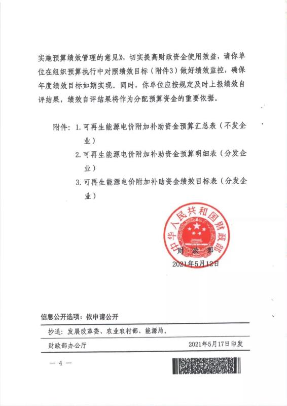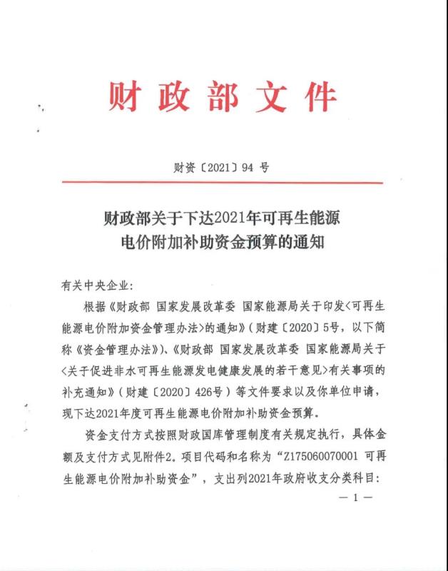 附件:《財政部關于下達2021年可再生能源電價附加補助資金預算的通知》(財資〔2021〕94號)