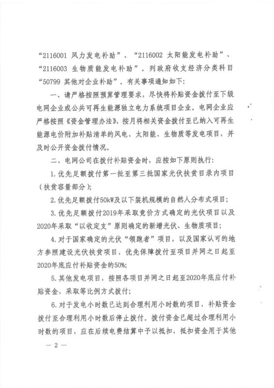 公司嚴格按照《財政部關于下達2021年可再生能源電價附加補助資金預算的通知》(財資〔2021〕94號)中明確的補貼資金撥付原則和順序,在收到財政部撥付款項后,對納入補貼目錄或清單且滿足結(jié)算條件的各類項目進行及時、足額轉(zhuǎn)付。具體原則以各省電力公司公告為準。
