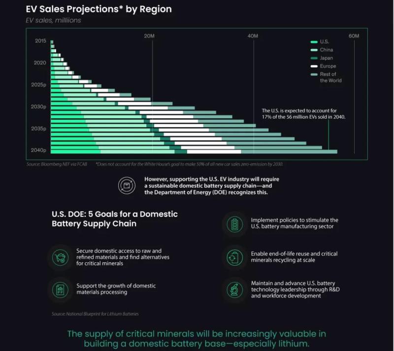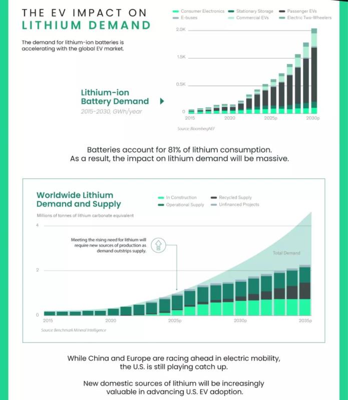 然而,更多的電動(dòng)汽車(chē)需要更多的電池,更多的電池需要更多的原材料,尤其是鋰。2020年,電池生產(chǎn)占鋰消費(fèi)量的81%,且需求量不斷增加。據(jù)彭博社報(bào)道,到2030年全球每年可能需要2000 GWh的鋰離子電池,而2020年為223 GWh。鑒于鋰是這些電池的關(guān)鍵成分,對(duì)鋰需求的影響將是巨大的。事實(shí)上,預(yù)計(jì)2025年全球鋰需求將超過(guò)供應(yīng)。此外,到2030年,全球?qū)⒂?00家電池巨型工廠開(kāi)工建設(shè),每年可能需要300萬(wàn)噸鋰,約為目前產(chǎn)量的37倍。隨著全球電動(dòng)汽車(chē)市場(chǎng)的擴(kuò)大,滿足日益增長(zhǎng)的鋰需求將需要新的生產(chǎn)來(lái)源。美國(guó)尤其如此,美國(guó)正在努力建立國(guó)內(nèi)電池供應(yīng)鏈,但目前只擁有一個(gè)鋰礦生產(chǎn)基地。