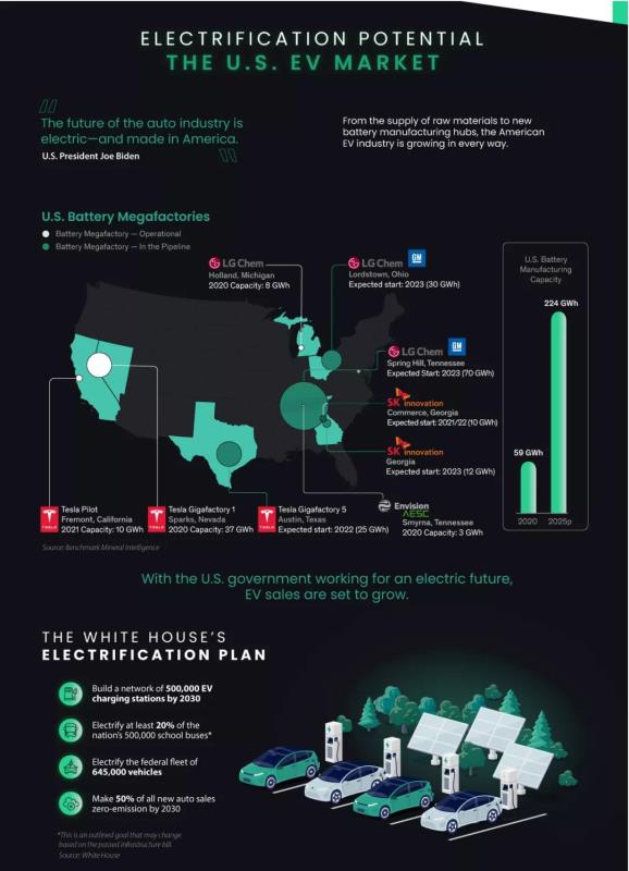 美國(guó)政府也在盡其所能支持電動(dòng)汽車(chē)的發(fā)展。最近通過(guò)的萬(wàn)億美元基礎(chǔ)設(shè)施法案支持白宮的電氣化計(jì)劃,其中75億美元用于建設(shè)電動(dòng)汽車(chē)充電站網(wǎng)絡(luò),另外50億美元用于低排放和零排放公交車(chē)。2021年早些時(shí)候,拜登總統(tǒng)簽署了一項(xiàng)行政命令,目標(biāo)是到2030年使50%的新車(chē)銷(xiāo)售是電動(dòng)汽車(chē)。