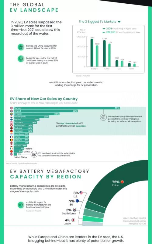 2020年全球電動(dòng)汽車(chē)和插電式混合動(dòng)力汽車(chē)銷(xiāo)量首次突破300萬(wàn),而2021年上半年的數(shù)據(jù)表明,2021年可能會(huì)再創(chuàng)歷史新高。歐洲和中國(guó)在這兩年一直是領(lǐng)先的電動(dòng)汽車(chē)市場(chǎng),插電式混合動(dòng)力和電池電動(dòng)汽車(chē)(BEV)80%以上的銷(xiāo)售都在這兩個(gè)地區(qū)。盡管?chē)?guó)家人口是絕對(duì)銷(xiāo)售潛力的驅(qū)動(dòng)因素,但政府激勵(lì)措施在擴(kuò)大電動(dòng)汽車(chē)采用方面起到了關(guān)鍵作用。例如,一些歐洲國(guó)家為購(gòu)買(mǎi)和擁有電動(dòng)汽車(chē)提供稅收優(yōu)惠,此外還有道路通行費(fèi)豁免等激勵(lì)措施,歐洲國(guó)家也在電動(dòng)汽車(chē)普及率排行榜上占據(jù)主導(dǎo)地位。2020年電動(dòng)汽車(chē)普及率最高的10個(gè)國(guó)家都是歐洲國(guó)家,挪威位居榜首。