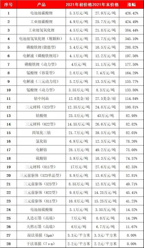 中國(guó)儲(chǔ)能網(wǎng)訊:2021年,是鋰電原材料價(jià)格不斷上漲的一年。如下圖所示,28種鋰電材料價(jià)格中,26種價(jià)格上漲,無一下跌。