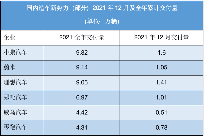 聚焦于國內(nèi)市場的造車新勢力企業(yè)在2021年也有不俗表現(xiàn)。其中,“蔚小理”(蔚來汽車、小鵬汽車和理想汽車)三家車企的全年累計(jì)交付量均超過9萬輛,向10萬輛關(guān)口邁進(jìn)。其中,2021年12月,蔚來、小鵬汽車、理想汽車和哪吒汽車的交付量繼續(xù)突破萬輛關(guān)口。