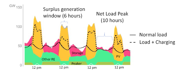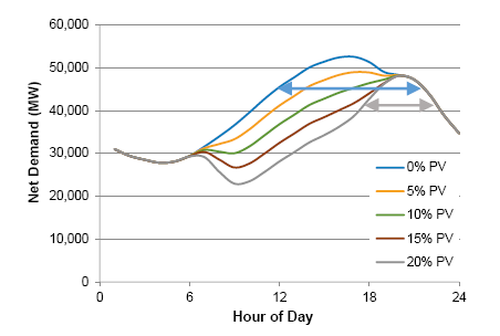 凈負(fù)荷峰值期間的長(zhǎng)度也受到可變可再生能源(VRE)部署的影響,尤其是太陽(yáng)能發(fā)電設(shè)施(PV)。圖3提供了一個(gè)示例,說(shuō)明了儲(chǔ)能系統(tǒng)在沒(méi)有與太陽(yáng)能發(fā)電設(shè)施配套部署的情況下,滿足電力系統(tǒng)峰值需求可能需要8小時(shí)或更長(zhǎng)時(shí)間(藍(lán)色箭頭)的情況。然而,當(dāng)儲(chǔ)能系統(tǒng)從光伏發(fā)電設(shè)施每年獲得20%的發(fā)電量時(shí),這個(gè)儲(chǔ)能系統(tǒng)只需要4小時(shí)的持續(xù)時(shí)間即可實(shí)現(xiàn)與8小時(shí)持續(xù)時(shí)間儲(chǔ)能系統(tǒng)相同的降低凈負(fù)荷水平(灰色箭頭)。