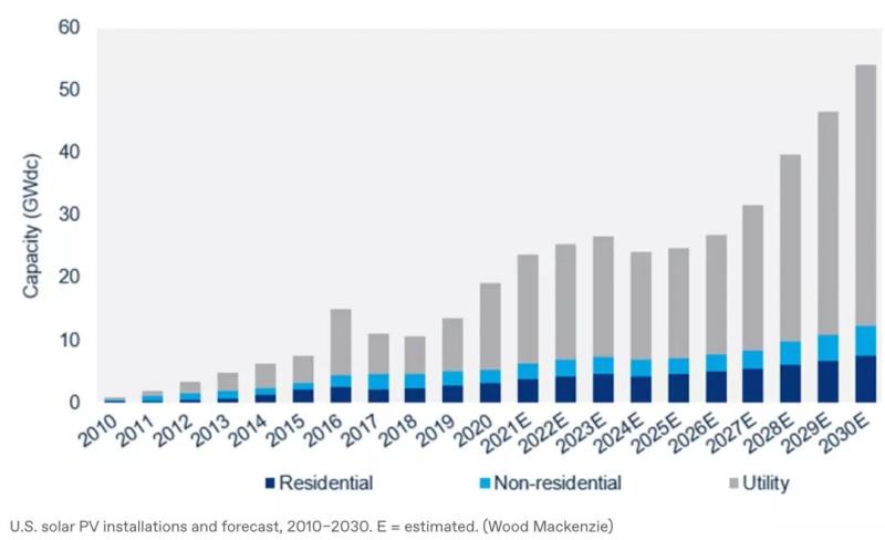 美國(guó)的太陽(yáng)能增長(zhǎng)速度驚人且持續(xù)。除了2021年預(yù)計(jì)在美國(guó)部署的23吉瓦外,研究機(jī)構(gòu)標(biāo)準(zhǔn)普爾全球市場(chǎng)情報(bào)公司(S& P Global Market Intelligence)還預(yù)測(cè)2022年將有44吉瓦的光伏投入使用,與2021年相比幾乎翻了一番。