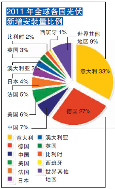 二是全球光伏安裝量大幅上升。受太陽能組件價(jià)格大幅度下跌、光伏安裝成本大幅下降的影響,2011年全球光伏安裝量大幅度上升。據(jù)歐洲光伏產(chǎn)業(yè)協(xié)會(huì)(EPIA)發(fā)布的最新統(tǒng)計(jì)報(bào)告顯示,2011年全球光伏發(fā)電安裝量突破27.7GW,同比2010年增長70%,創(chuàng)歷史新高。意大利和德國成為全球新增安裝量最高的國家,占全球市場60%(見圖)。而歐洲繼續(xù)統(tǒng)領(lǐng)全球光伏市場,占全球市場的75%,較2010年下降5%(2010年歐洲占全球市場的80%)。根據(jù)EPIA數(shù)據(jù),意大利、德國、中國、美國、法國和日本在2011年安裝量超過1GW。其中意大利新增并網(wǎng)安裝量為9GW,德國7.5GW,中國2GW,美國1.6GW,法國1.5GW,日本1.1GW,澳大利亞700MW,英國700MW,比利時(shí)550MW,西班牙400MW,印度300MW等。2011年全球累計(jì)安裝量達(dá)67.4GW,較2010年底的39.7GW增長70%。