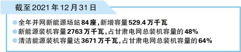 中國儲(chǔ)能網(wǎng)訊:截至2021年12月31日,甘肅電網(wǎng)全年并網(wǎng)新能源場站84座,新增容量529.4萬千瓦,同比增長24%,刷新了國網(wǎng)甘肅省電力公司年度新能源投產(chǎn)歷史紀(jì)錄,其中新增風(fēng)電368.7萬千瓦(45座風(fēng)力發(fā)電廠)、光伏160.7萬千瓦(39座光伏電站)。甘肅電網(wǎng)新能源裝機(jī)容量達(dá)2763萬千瓦,占全網(wǎng)總裝機(jī)容量的48%,清潔能源裝機(jī)容量達(dá)3671萬千瓦,占全網(wǎng)總裝機(jī)容量的64%。
