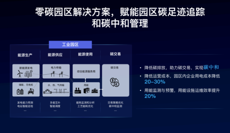 據(jù)介紹,“零碳園區(qū)解決方案”可以為園區(qū)內(nèi)企業(yè)提供發(fā)電能力預(yù)測、電站智能巡檢、智能調(diào)度、能耗監(jiān)測和分析、碳中和監(jiān)測等AI能力,賦能園區(qū)碳足跡追蹤和碳中和管理,降低碳排放,助力碳交易。