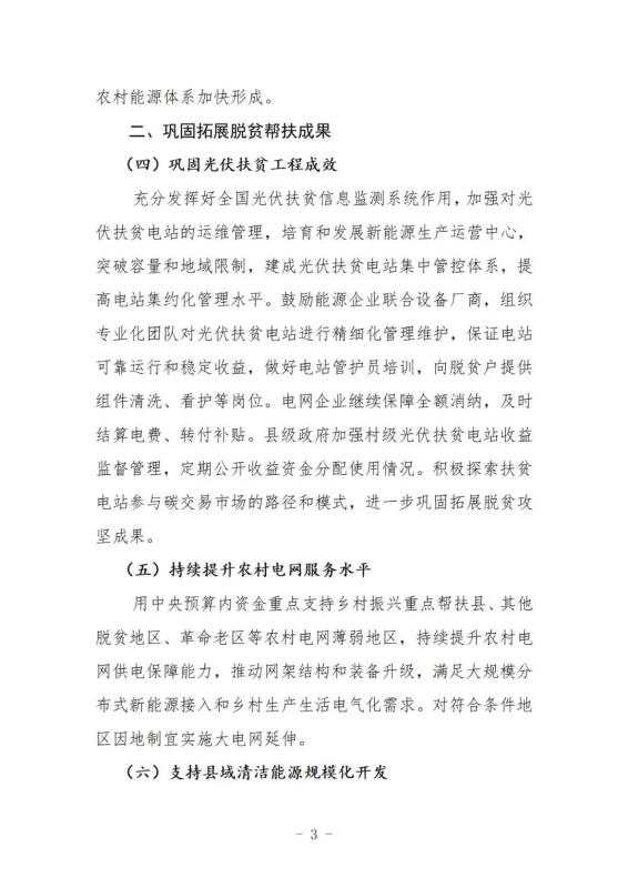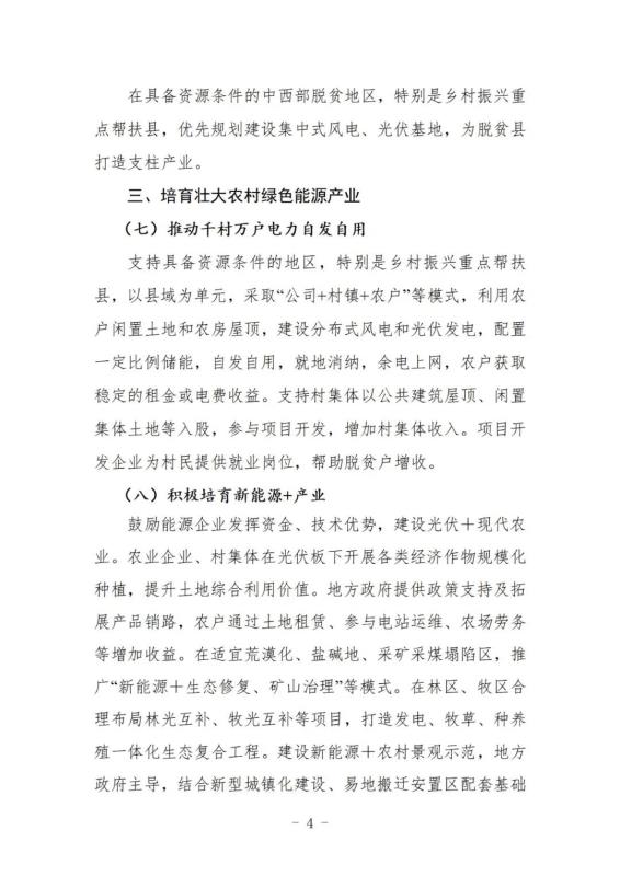 推動千村萬戶電力自發(fā)自用。支持具備資源條件的地區(qū),特別是鄉(xiāng)村振興重點幫扶縣,以縣域為單元,采取“公司+村鎮(zhèn)+農(nóng)戶”等模式,利用農(nóng)戶閑置土地和農(nóng)房屋頂,建設(shè)分布式風電和光伏發(fā)電,配置一定比例儲能,自發(fā)自用,就地消納,余電上網(wǎng),農(nóng)戶獲取穩(wěn)定的租金或電費收益。支持村集體以公共建筑屋頂、閑置集體土地等入股,參與項目開發(fā),增加村集體收入。項目開發(fā)企業(yè)為村民提供就業(yè)崗位,幫助脫貧戶增收。