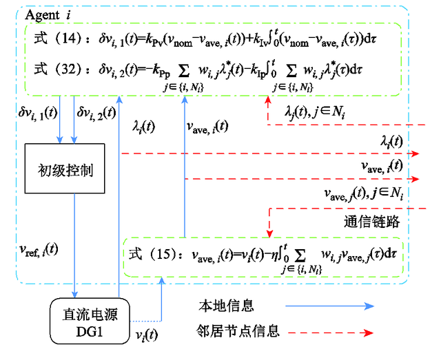 針對(duì)直流微電網(wǎng)經(jīng)濟(jì)調(diào)度問(wèn)題,近年來(lái)提出了一些分布式經(jīng)濟(jì)調(diào)度策略。有學(xué)者基于有限步一致性算法設(shè)計(jì)了交直流混合微電網(wǎng)分布式經(jīng)濟(jì)調(diào)度策略。然而,該控制策略沒(méi)有考慮交直流混合微電網(wǎng)的電壓、頻率二次調(diào)節(jié)。有學(xué)者提出一種直流微電網(wǎng)分布式分層控制策略:在其三次控制層,通過(guò)分布式一致算法調(diào)整下垂控制的虛擬阻抗以實(shí)現(xiàn)經(jīng)濟(jì)調(diào)度;在二次控制層,通過(guò)分布式一致算法生成下垂控制的電壓補(bǔ)償量以實(shí)現(xiàn)電壓恢復(fù)。然而,三次優(yōu)化調(diào)度層的時(shí)間尺度大于二次電壓恢復(fù)控制層,無(wú)法在同一小時(shí)間尺度下對(duì)微電網(wǎng)進(jìn)行控制與優(yōu)化,從而無(wú)法進(jìn)一步提高直流電網(wǎng)運(yùn)行效率。此外,虛擬阻抗的大范圍實(shí)時(shí)調(diào)整給系統(tǒng)的電壓穩(wěn)定控制帶來(lái)挑戰(zhàn)。