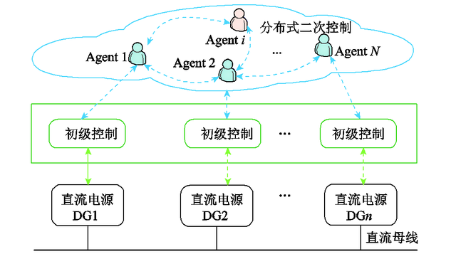 直流微電網(wǎng)分布式分層控制結(jié)構(gòu)如圖1所示,分層控制結(jié)構(gòu)通常包括初級(jí)控制、二次控制和三次控制(圖中未畫出),并且從下層到上層時(shí)間尺度依次增加。初級(jí)控制通常采用下垂控制策略,并通過(guò)控制各電源的輸出電壓和電流,實(shí)現(xiàn)負(fù)荷在各電源間的初級(jí)分配。二次控制通常負(fù)責(zé)微電網(wǎng)系統(tǒng)級(jí)的穩(wěn)定控制,如通過(guò)集中式或分布式的方式實(shí)現(xiàn)微電網(wǎng)母線電壓的恢復(fù)控制。三次控制通常負(fù)責(zé)管理微電網(wǎng)的優(yōu)化運(yùn)行,如經(jīng)濟(jì)調(diào)度。
