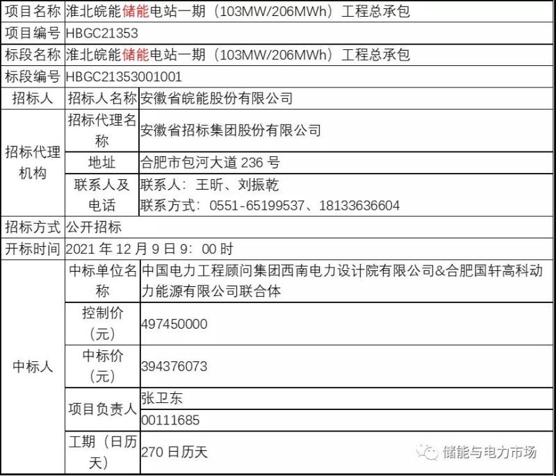 淮北皖能儲(chǔ)能電站一期(103MW/206MWh)工程總承包中標(biāo)結(jié)果公示