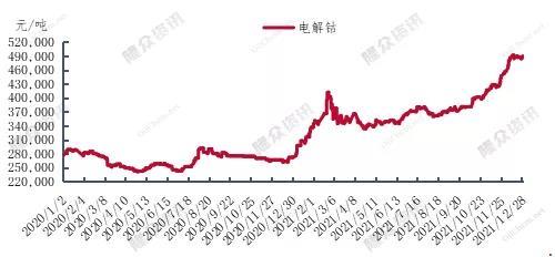 截止12月31日,電解鈷現(xiàn)貨均價48.7萬元/噸,較年初漲21.3萬元/噸,漲幅達77.74%。2021年全年最高價在496000元/噸,較年初上漲80.36%,全年均價375983元/噸,較去年上漲40.87%。