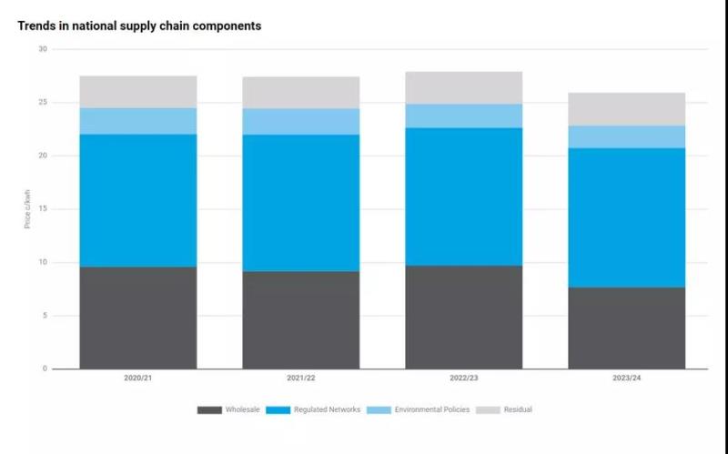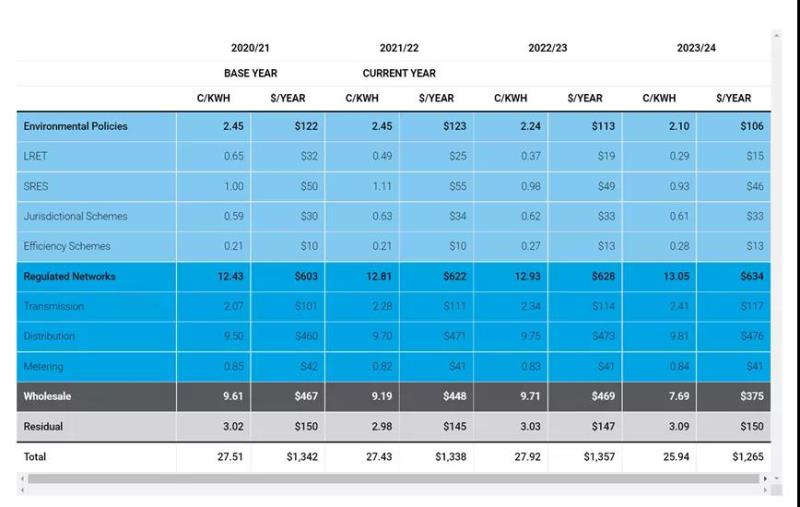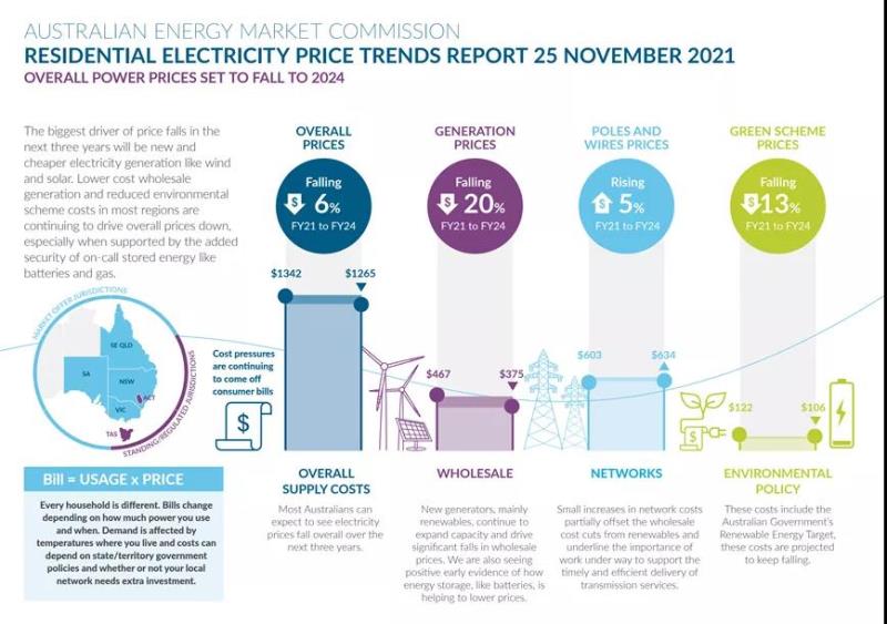 中國儲能網(wǎng)訊:澳大利亞能源市場委員會(AEMC)預(yù)計,到2024年,家庭用戶用電費用將較2021年下降約6%。其中,批發(fā)價格受可再生能源發(fā)電規(guī)模擴大、儲能快速發(fā)展等因素影響,將下降約20%;與環(huán)境計劃相關(guān)的價格減少約13%;輸配電價是唯一上漲的部分,預(yù)計小幅上漲5%左右。