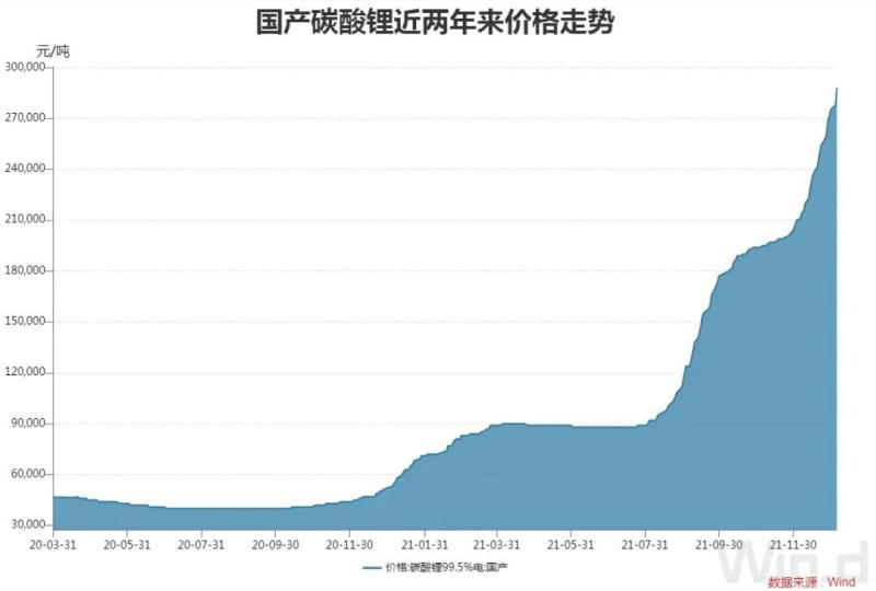 一方面,動力電池的上游原材料鎳、鈷、鋰等金屬價(jià)格波動之劇烈超出市場預(yù)期,如電池級碳酸鋰均價(jià)已從2021年初的5萬元/噸,一路跳漲到近期的29萬元/噸,漲幅達(dá)480%,最高報(bào)價(jià)甚至突破30萬元/噸,而鈷價(jià)也已創(chuàng)近3年來的新高。