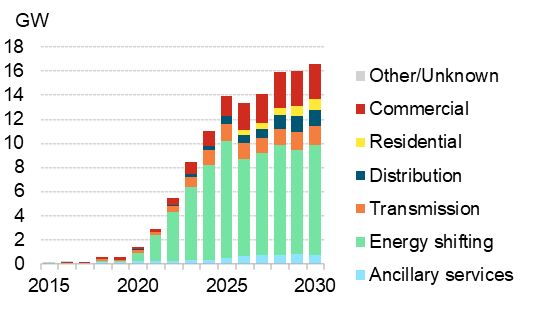在發(fā)電側(cè),儲能可單獨或與風光電站共建,起到電力調(diào)峰、輔助動態(tài)運行、系統(tǒng)調(diào)頻、可再生能源并網(wǎng)等作用。在電網(wǎng)側(cè),儲能可與氣電、火電一同參與電網(wǎng)側(cè)調(diào)峰調(diào)頻,以緩解電網(wǎng)阻塞、延緩輸配電設(shè)備擴容升級等問題。在用戶側(cè),儲能可以結(jié)合光伏,幫助用戶實現(xiàn)錯峰用電以節(jié)約電費,其還可以作為備用電源。