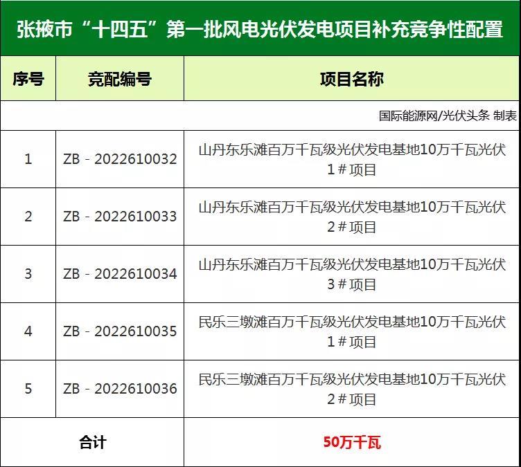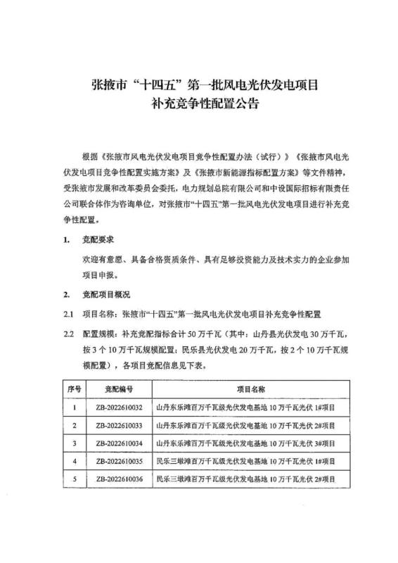 中國儲能網訊:1月10日,甘肅省張掖市人民政府發(fā)布張掖市“十四五”第一批風電光伏發(fā)電項目補充競爭性配置公告。根據公告,配置規(guī)模為:補充競配指標合計50萬千瓦(其中:山丹縣光伏發(fā)電30萬千瓦,按3個10萬千瓦規(guī)模配置;民樂縣光伏發(fā)電20萬千瓦,按2個10萬千瓦規(guī)模配置),各項目競配信息見下表。