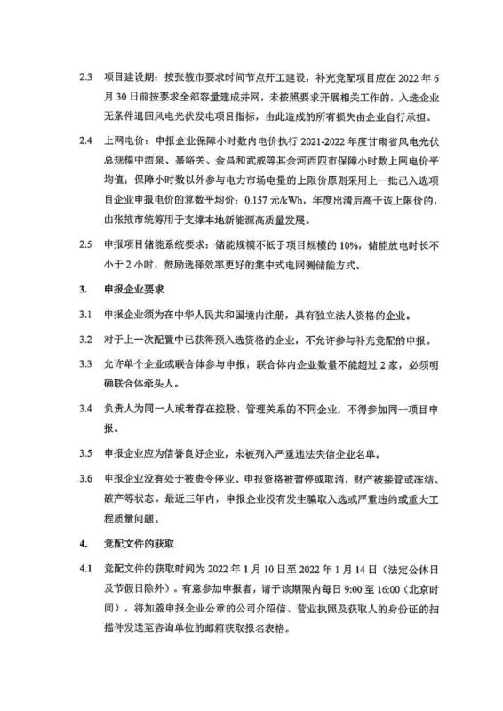 根據公告,項目建設期為按張掖市要求時間節(jié)點開工建設,補充競配項目應在2022年6月30日前按要求全部容量建成并網,未按照要求開展相關工作的,入選企業(yè)無條件退回風電光伏發(fā)電項目指標,由此造成的所有損失由企業(yè)自行承擔。