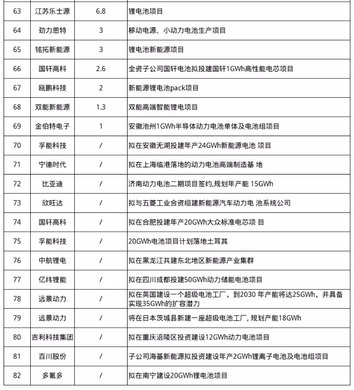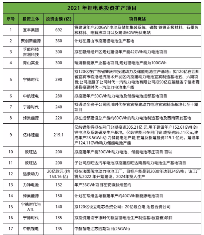 據(jù)不完全統(tǒng)計,2021年各個鋰電池企業(yè)投資擴產(chǎn)項目多達82個,投資金額累計超6700億元,新增裝機規(guī)模超1240GWh。