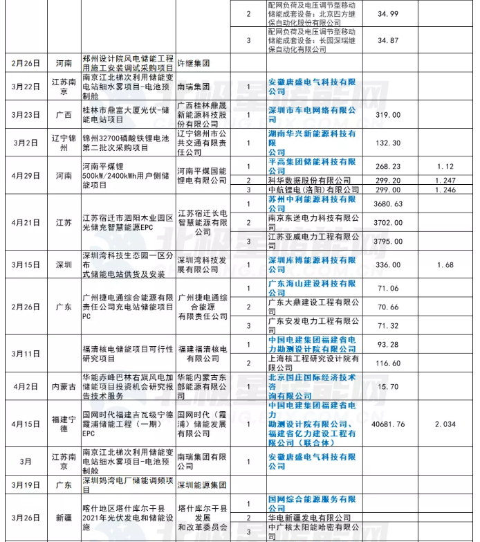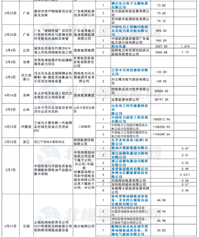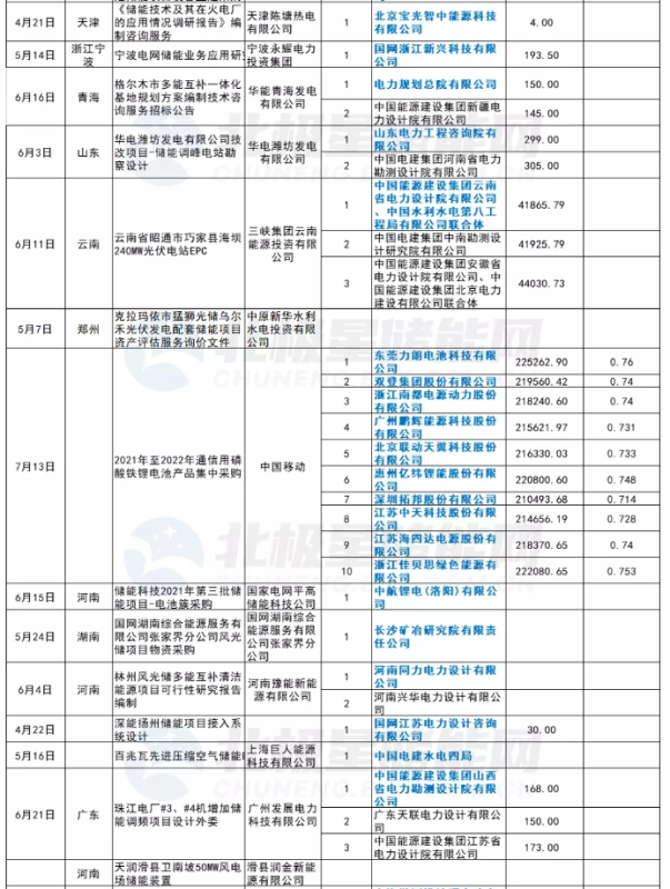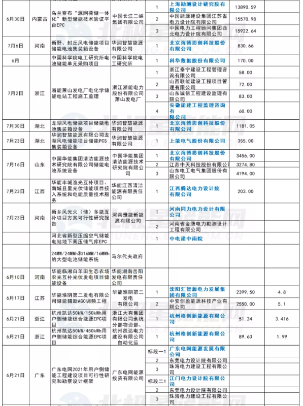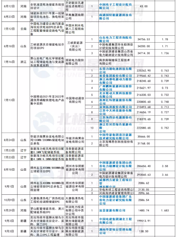 在新能源配套儲(chǔ)能項(xiàng)目中,最有看點(diǎn)的是中核匯能有限公司2021-2022年新能源項(xiàng)目配套儲(chǔ)能系統(tǒng)招標(biāo),共有南瑞繼保、上能電氣、陽光電源、科華數(shù)據(jù)、遠(yuǎn)景能源、智光儲(chǔ)能、欣旺達(dá)、上海采日、山東電工電氣、許繼電氣、東方日升、科士達(dá)、平高集團(tuán)、神州數(shù)碼等24家企業(yè)參與投標(biāo)。其中最高報(bào)價(jià)為中國(guó)電力工程顧問集團(tuán)西北電力設(shè)計(jì)院有限公司的44780萬,儲(chǔ)能單價(jià)2.17元/Wh,最低報(bào)價(jià)為中國(guó)電建集團(tuán)華東勘測(cè)設(shè)計(jì)研究院有限公司的38759.53萬,儲(chǔ)能單價(jià)1.88元/Wh,最終神州數(shù)碼、遠(yuǎn)景能源、上能電氣、平高集團(tuán)獲得中標(biāo)。