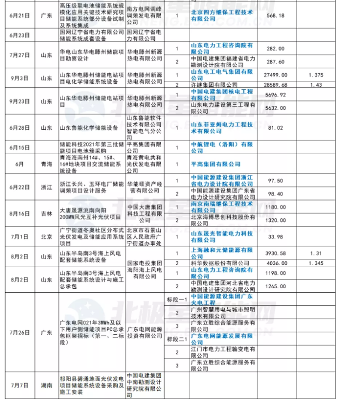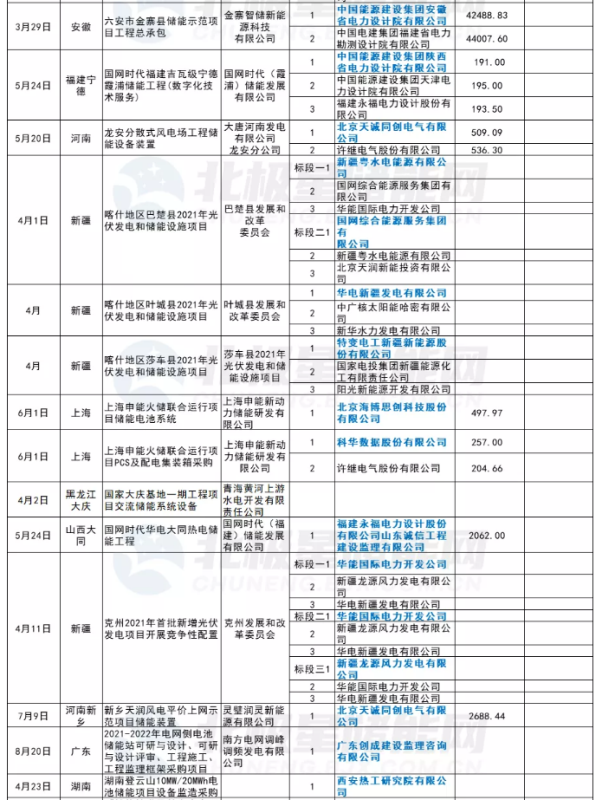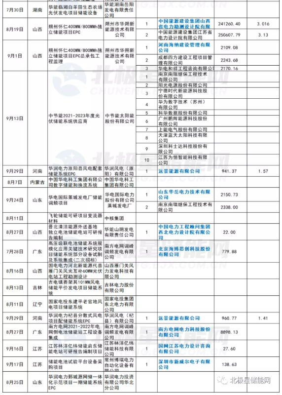 2021年9月,中節(jié)能太陽能股份有限公司2021年度-2023年度儲(chǔ)能系統(tǒng)供應(yīng)商中標(biāo)結(jié)果公示,南瑞繼保、陽光電源、寧德時(shí)代、上能電氣、科華數(shù)據(jù)、華為等10家企業(yè)獲得中標(biāo),這也是今年單次招標(biāo)中中標(biāo)企業(yè)最多的一個(gè)標(biāo)的。
