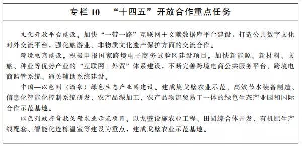 共建國際合作產(chǎn)業(yè)園區(qū)。依托大型骨干企業(yè)、高新技術(shù)開發(fā)區(qū)、高新技術(shù)產(chǎn)業(yè)園區(qū),強(qiáng)化國際產(chǎn)業(yè)合作,共建國際合作產(chǎn)業(yè)園。以節(jié)水設(shè)備制造、戈壁農(nóng)業(yè)開發(fā)、優(yōu)質(zhì)農(nóng)產(chǎn)品生產(chǎn)為重點,加強(qiáng)與以色列的全方位合作,推進(jìn)中以(酒泉)綠色生態(tài)產(chǎn)業(yè)園建設(shè)。支持相關(guān)企業(yè)在中亞、西亞、非洲、中東歐等地區(qū)建立境外合作產(chǎn)業(yè)園、科研中心,打造高水平海外產(chǎn)業(yè)創(chuàng)新服務(wù)綜合體。