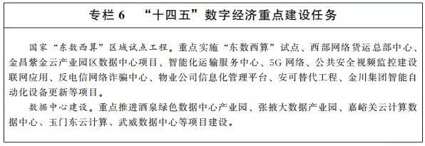 推動數(shù)字產(chǎn)業(yè)化。搶抓數(shù)字經(jīng)濟(jì)發(fā)展機(jī)遇,積極服務(wù)“東數(shù)西算”,爭取與上海、深圳等地區(qū)合作,努力打造絲綢之路經(jīng)濟(jì)帶區(qū)域信息匯集中心和大數(shù)據(jù)產(chǎn)業(yè)高地。按照全國一體化大數(shù)據(jù)中心協(xié)同創(chuàng)新體系要求,將張掖、金昌、酒泉等打造成支點性數(shù)據(jù)中心。