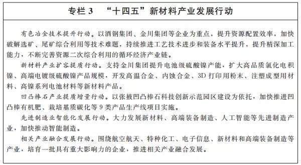 加強(qiáng)先進(jìn)制造業(yè)基地建設(shè)。依托金昌經(jīng)濟(jì)技術(shù)開發(fā)區(qū)、張掖經(jīng)濟(jì)技術(shù)開發(fā)區(qū)、玉門經(jīng)濟(jì)開發(fā)區(qū)、嘉峪關(guān)工業(yè)園區(qū)等園區(qū),建設(shè)以石化通用裝備、新能源裝備及農(nóng)機(jī)裝備、有色金屬制造等為重點的先進(jìn)制造業(yè)基地。依托鎳鈷新材料創(chuàng)新中心等省級制造業(yè)創(chuàng)新中心,推動重離子加速器癌癥治療裝備制造、高端醫(yī)用材料制造、粉末金屬材料制造發(fā)展。以機(jī)器人及其關(guān)鍵零部件、高速高精加工裝備和智能成套裝備為重點,大力發(fā)展智能制造業(yè)。