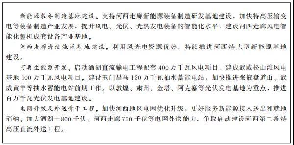 國家新能源產(chǎn)業(yè)基地。積極打造河西走廊國家新能源綜合示范區(qū),建設(shè)我國重要的新能源綜合利用基地、新能源生產(chǎn)和全產(chǎn)業(yè)鏈基地、新能源科技進(jìn)步和體制機(jī)制創(chuàng)新基地。