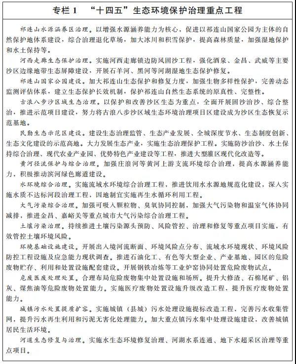生態(tài)文明水平顯著提高。祁連山生態(tài)屏障更加穩(wěn)固,區(qū)域生態(tài)治理取得新成效,環(huán)境突出問題得到有效整治,地級城市空氣質(zhì)量平均優(yōu)良天數(shù)比例達(dá)到93%。節(jié)水型社會基本形成,萬元地區(qū)生產(chǎn)總值用水量較2020年下降16%。生態(tài)環(huán)境監(jiān)管和區(qū)域生態(tài)保護(hù)補(bǔ)償機(jī)制更加完善。