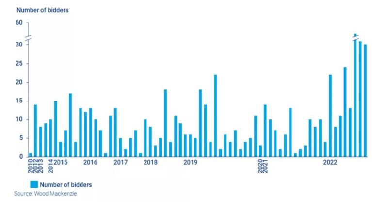 圖表:海上風(fēng)電招標(biāo)項(xiàng)目及租賃區(qū)域項(xiàng)目的競(jìng)標(biāo)企業(yè)數(shù)量統(tǒng)計(jì)
