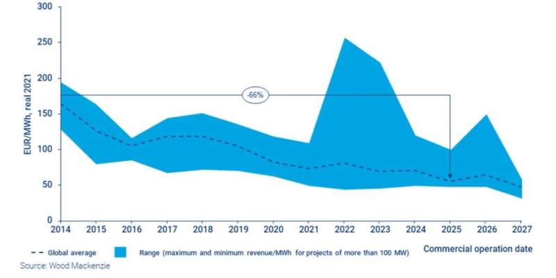 在海上風(fēng)電連續(xù)六年以“項(xiàng)目中標(biāo)價(jià)格持續(xù)創(chuàng)新低”霸屏后,全新的記錄又產(chǎn)生了。以歐元為單位,2021年投運(yùn)的海上風(fēng)電項(xiàng)目,其每兆瓦時(shí)項(xiàng)目收益較2014年平均水平下降了55%。根據(jù)最近的中標(biāo)情況及伍德麥肯茲電價(jià)預(yù)測(cè),2025年海上風(fēng)電項(xiàng)目每兆瓦時(shí)收益將較2021年再度降低25%。*